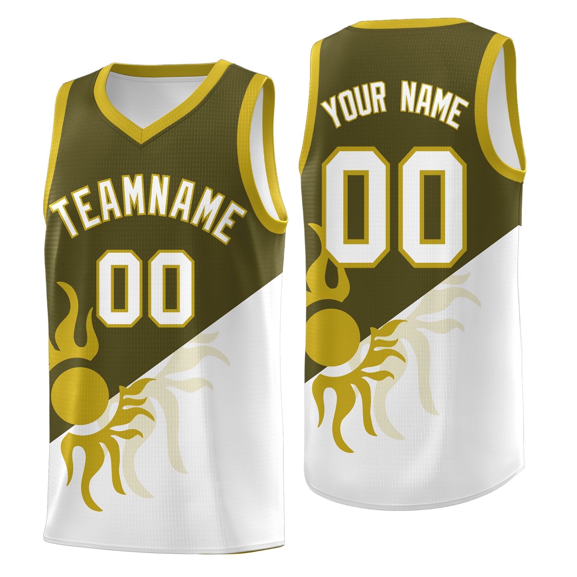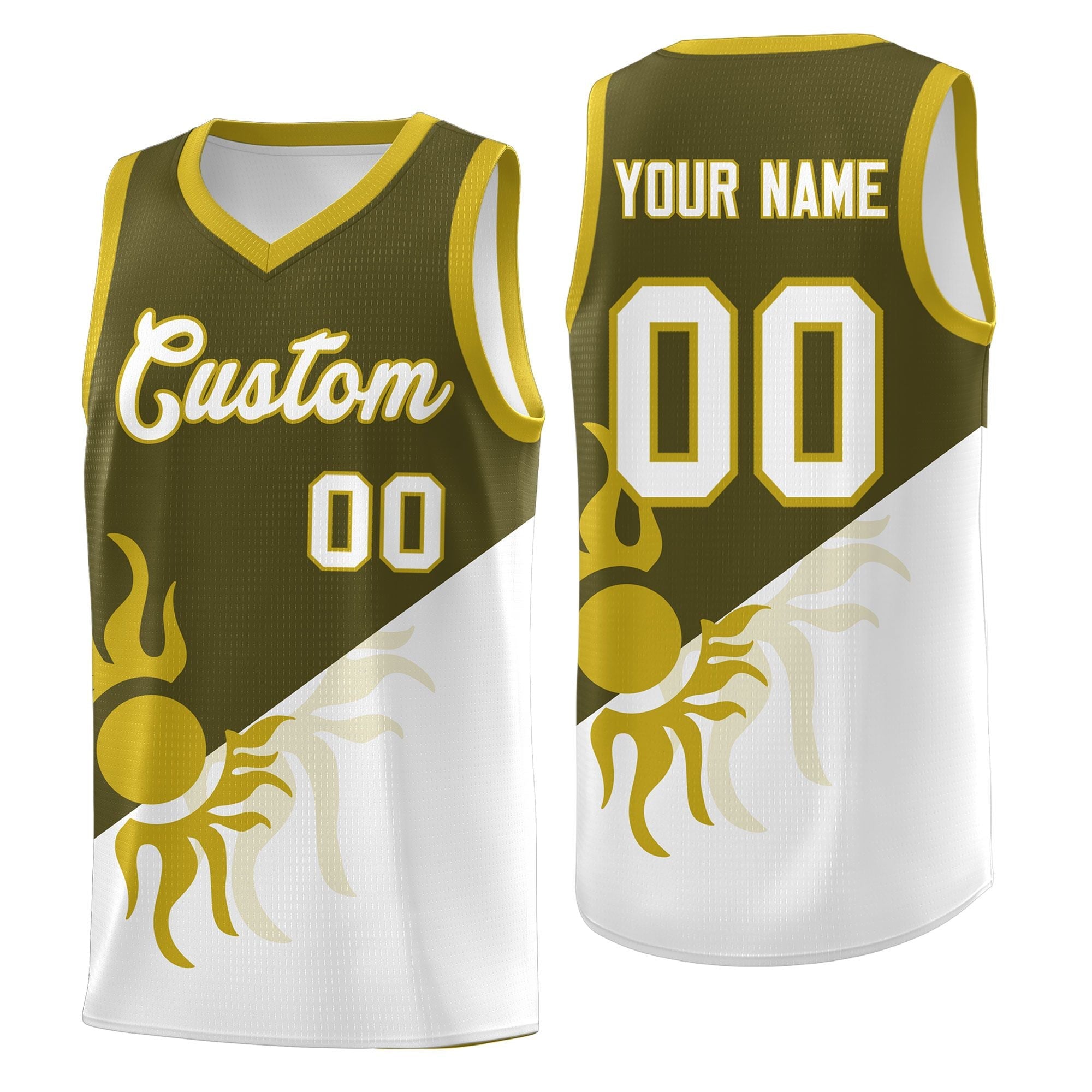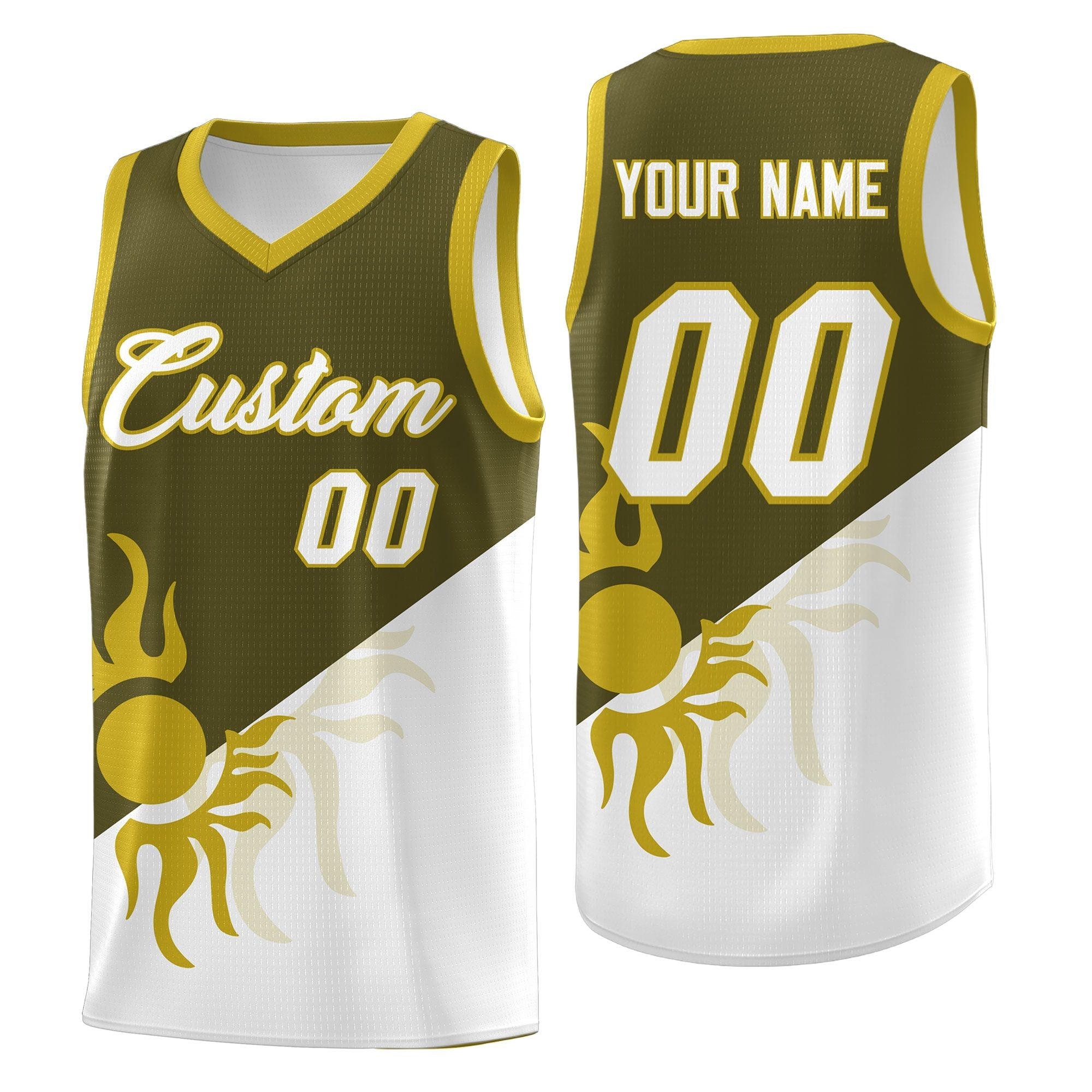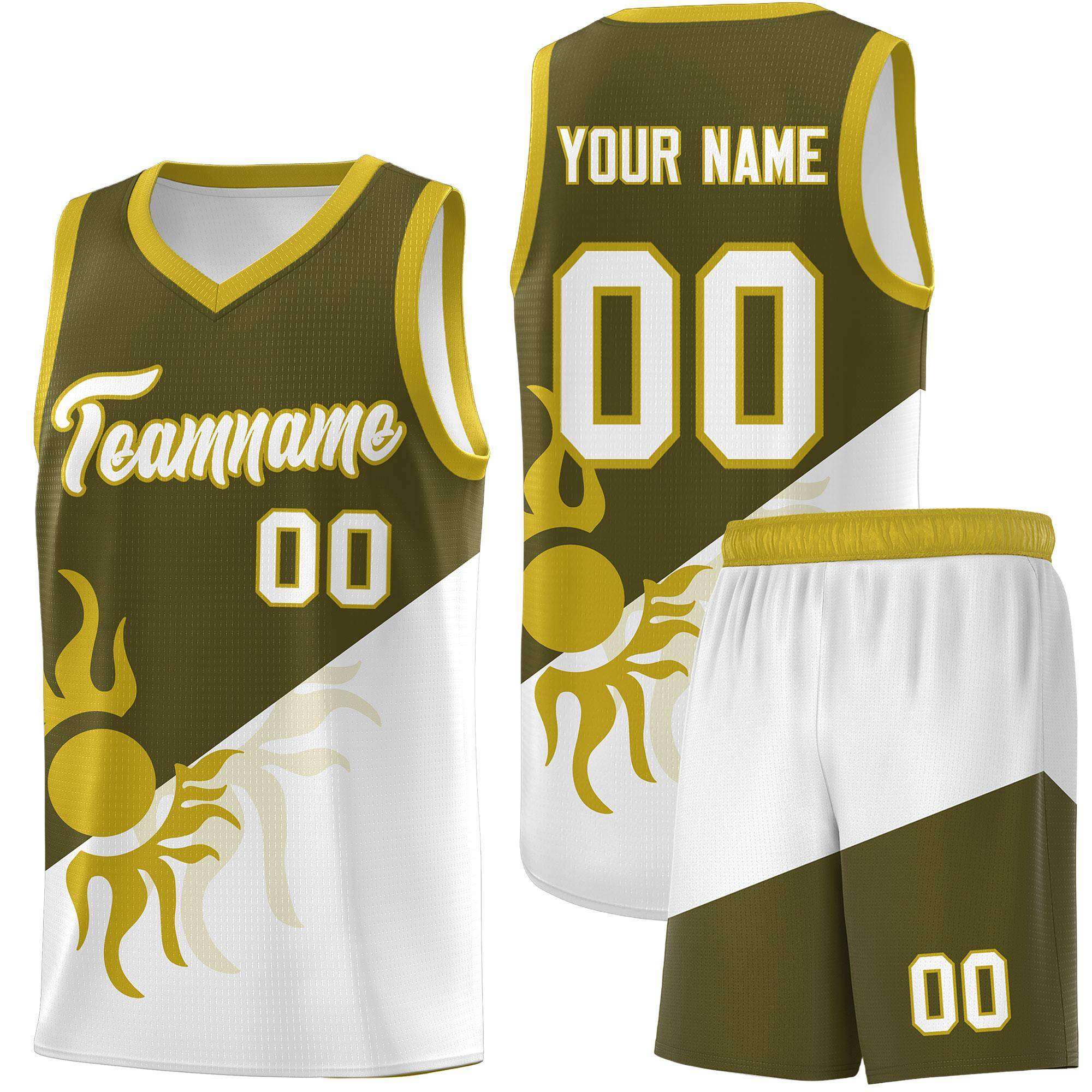 Custom Olive White Sunburst Design Two Tone Quick-Drying Uniform Basketball Jersey