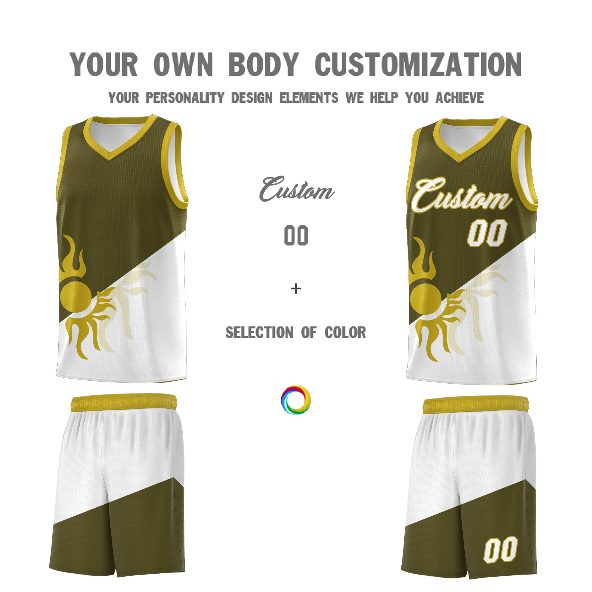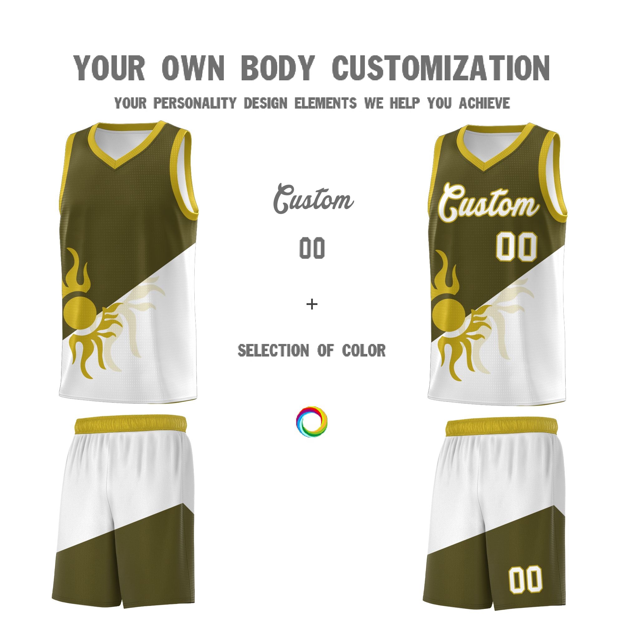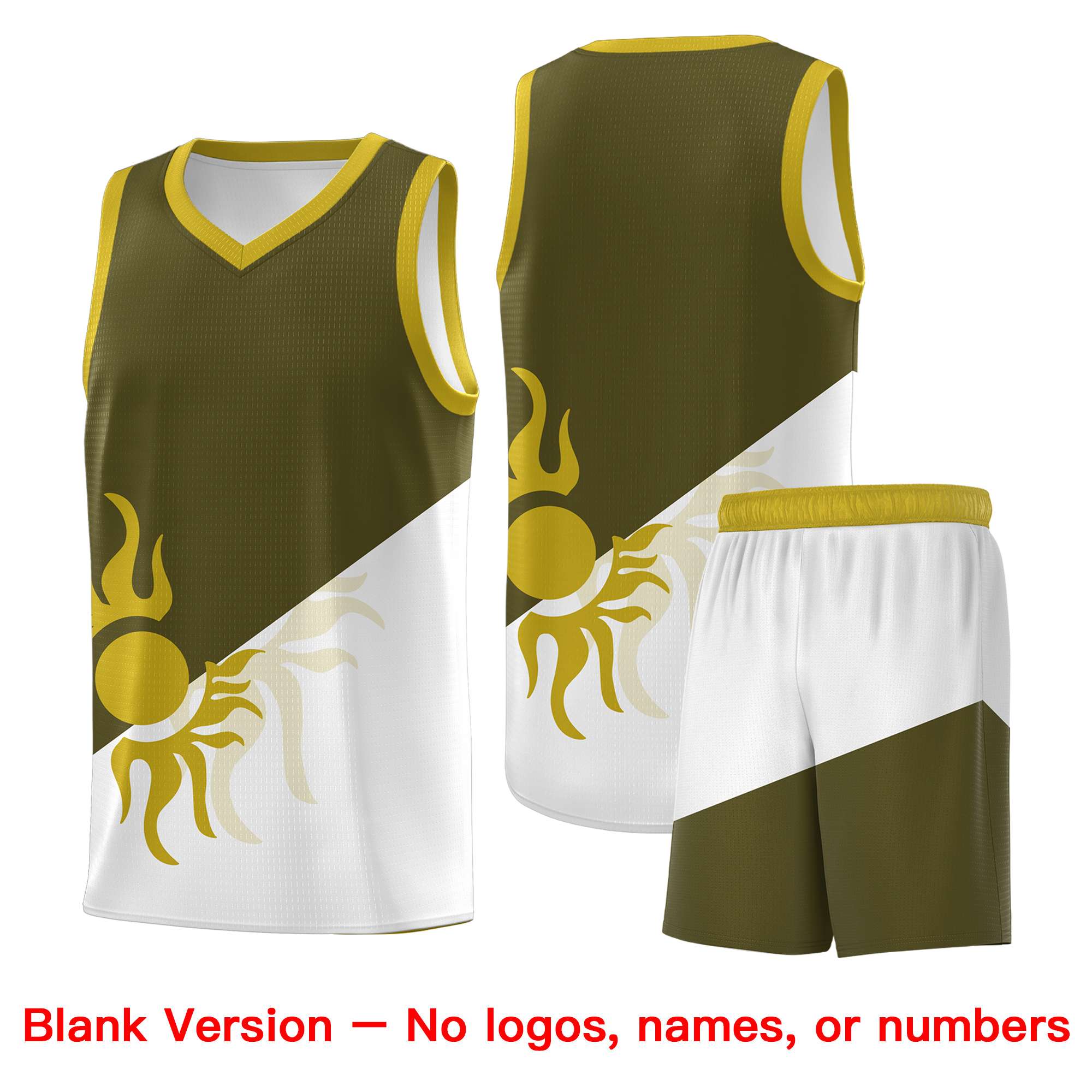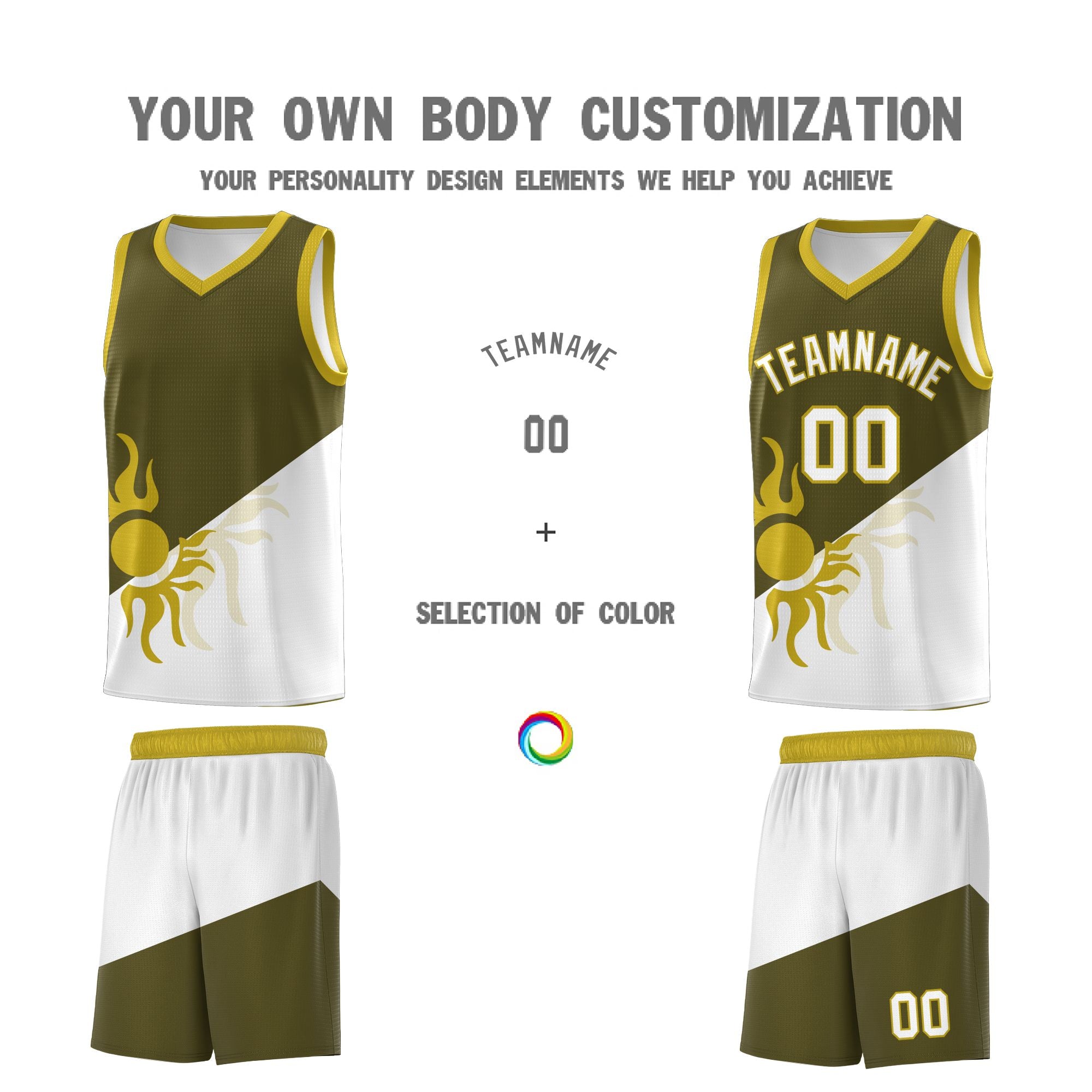 Custom Olive White Sunburst Design Two Tone Quick-Drying Uniform Basketball Jersey