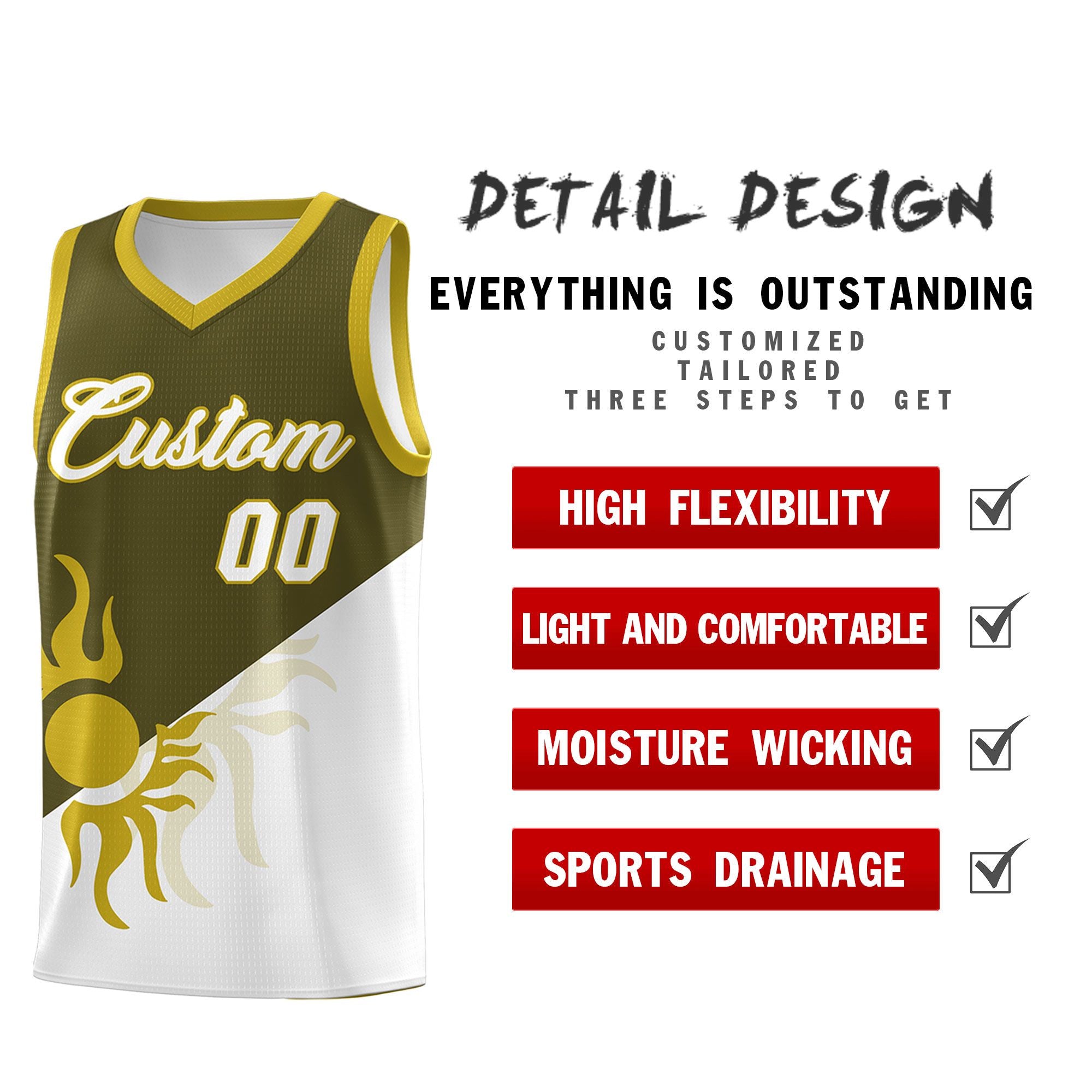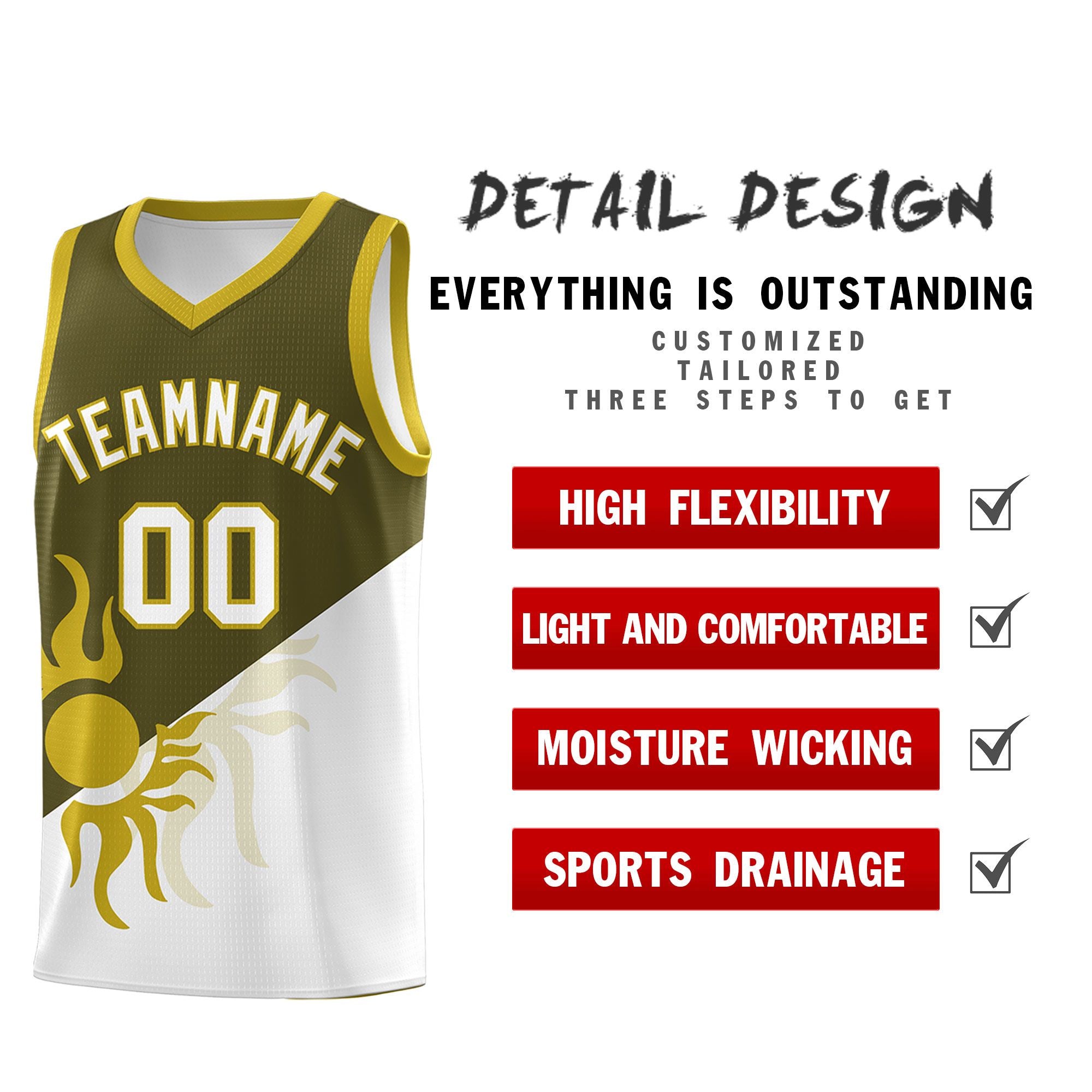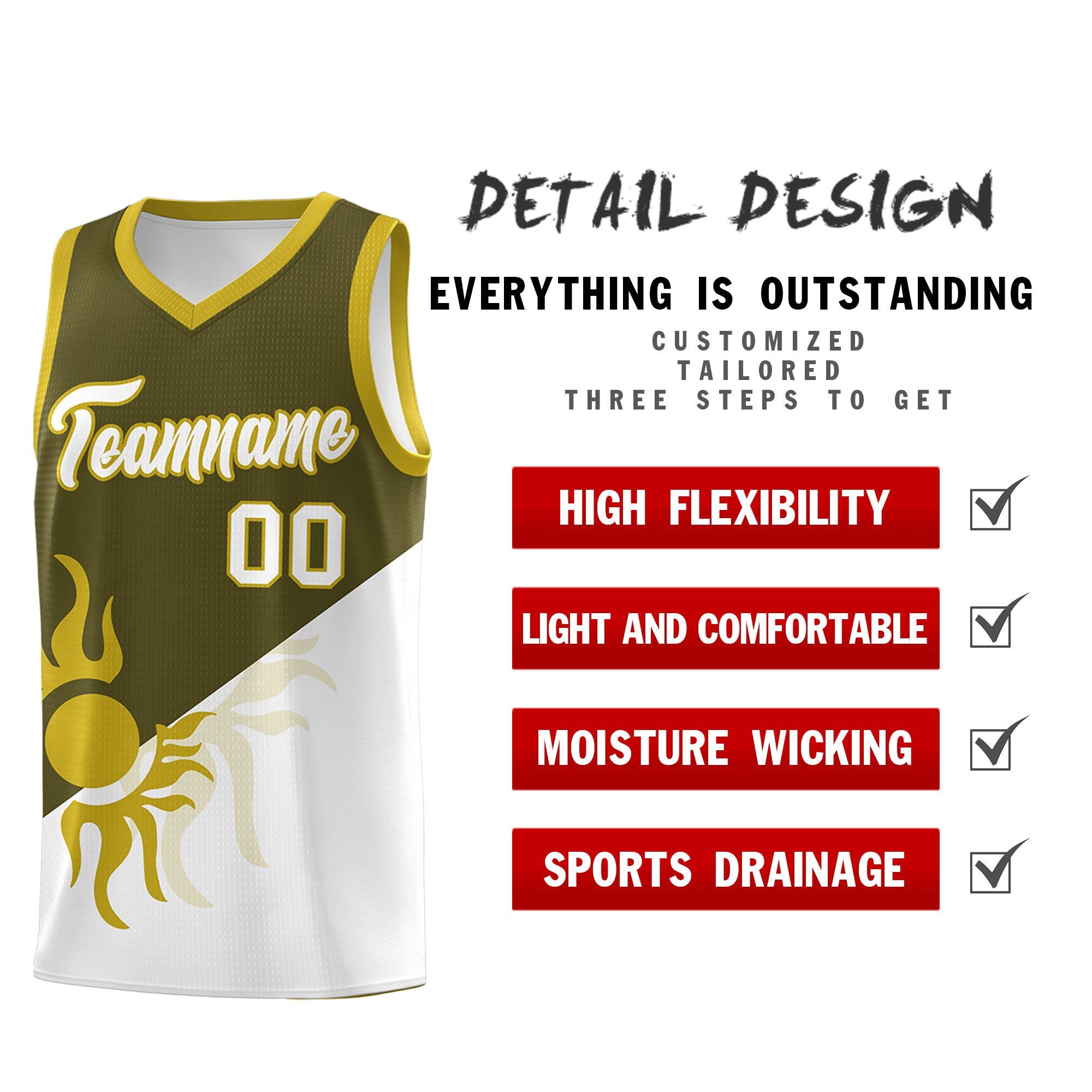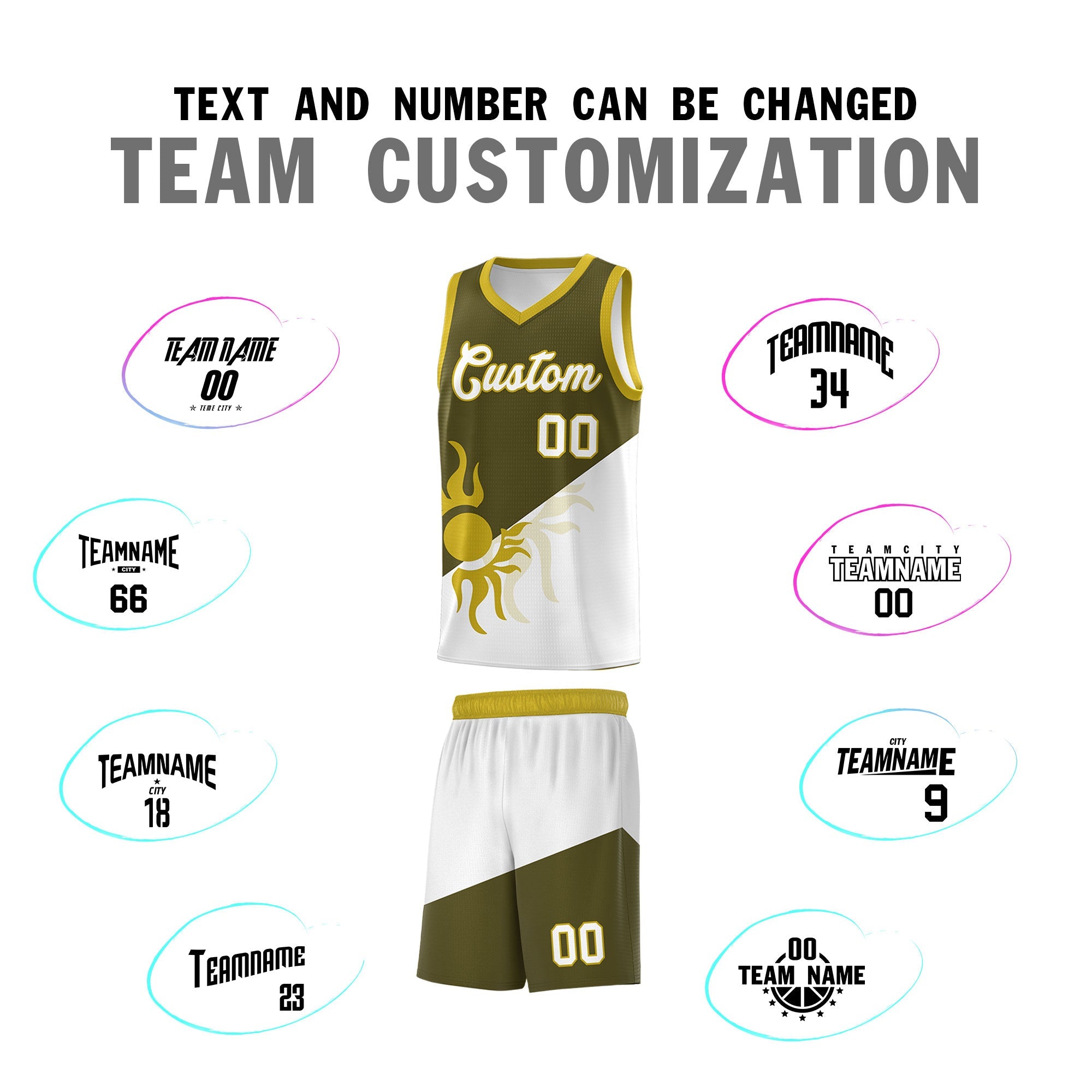 Custom Olive White Sunburst Design Two Tone Quick-Drying Uniform Basketball Jersey