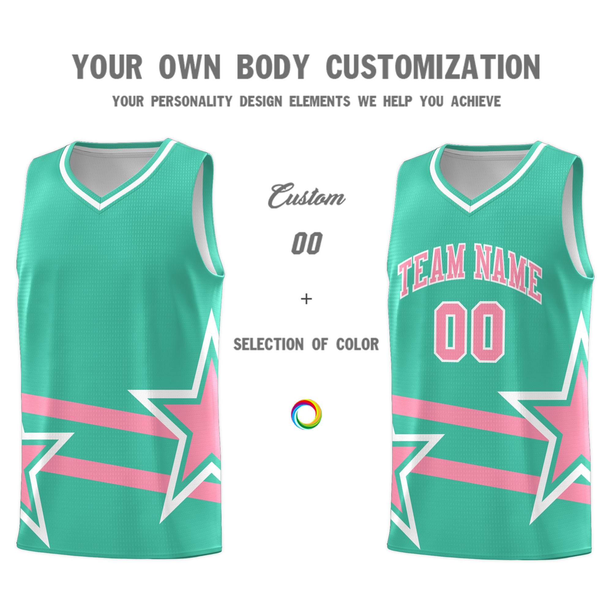 Custom Bright Green Basketball Kits With Light Pink Star Pattern And Double Lines