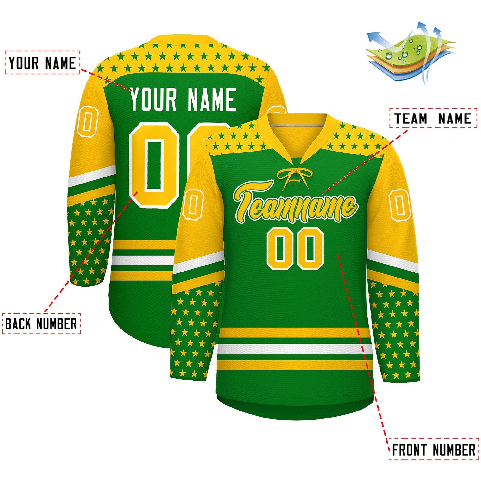 Custom Kelly Green Gold White Star Series Personalization Lace-Up Neck Hockey Jersey