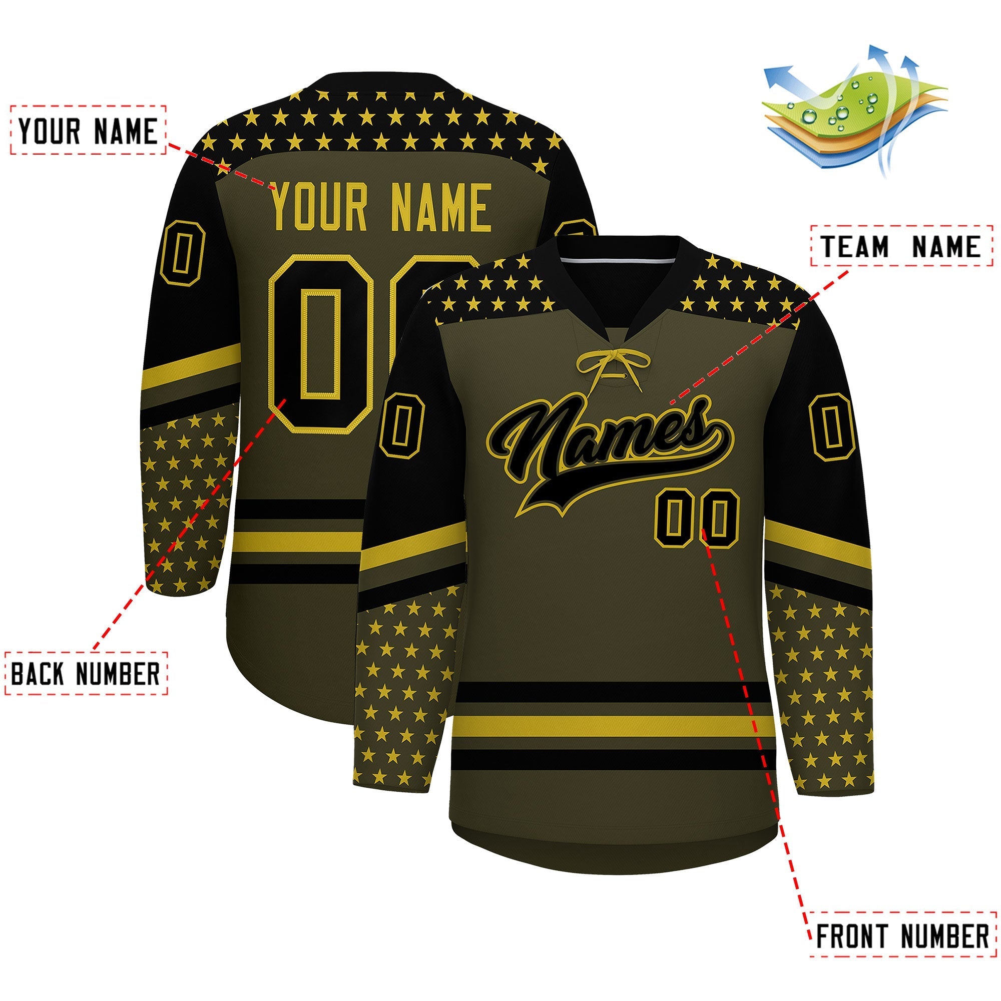 Custom Olive Black Old Gold Star Series Personalization Lace-Up Neck Hockey Jersey