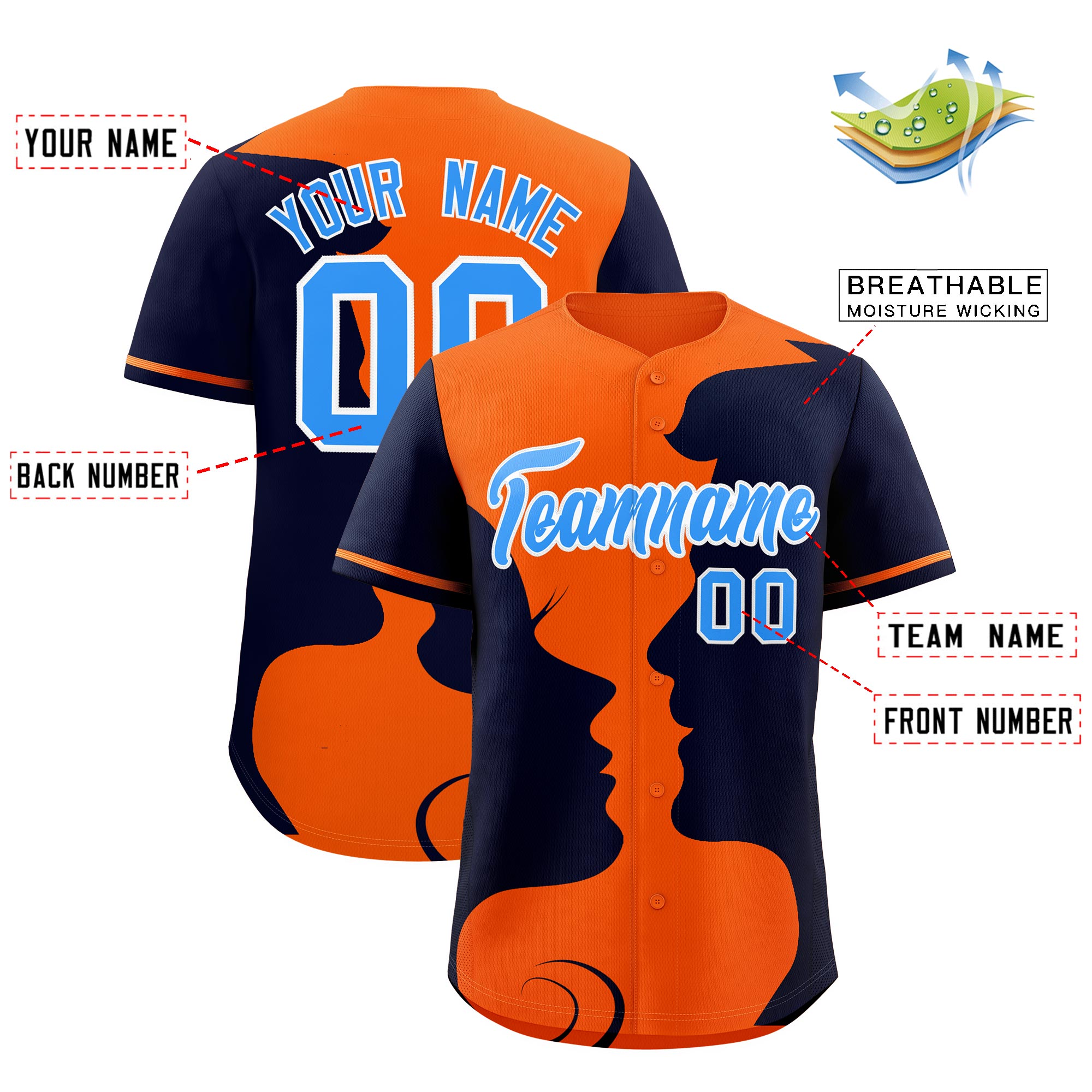 Custom Orange Navy Silhouettes of Loving Couple Valentine's Day Baseball Jersey