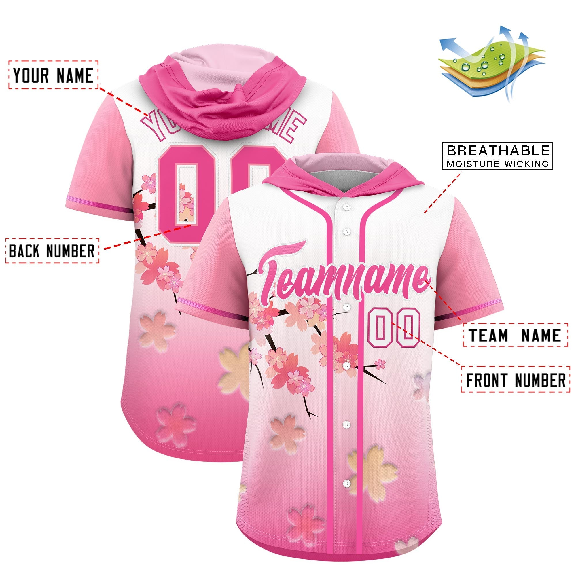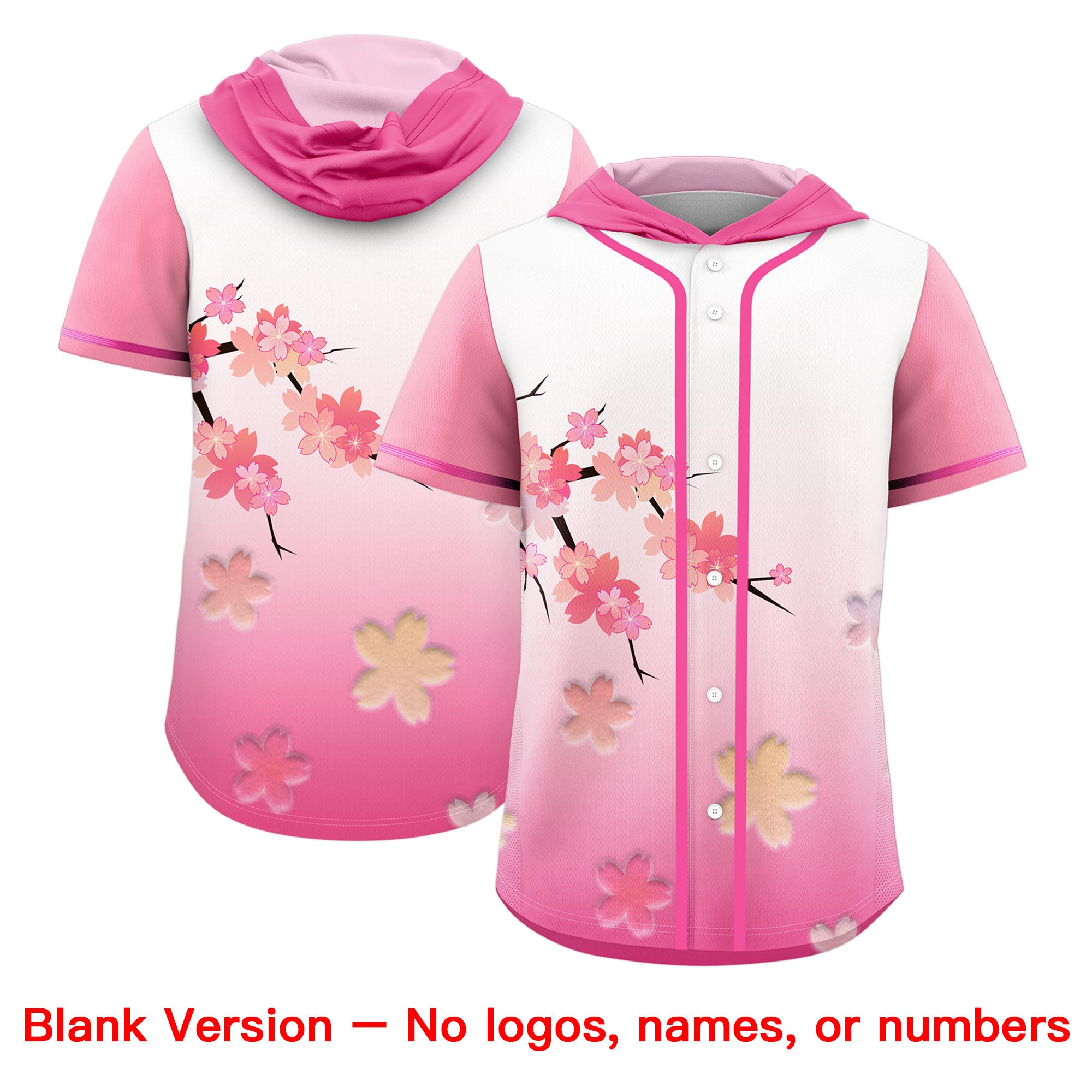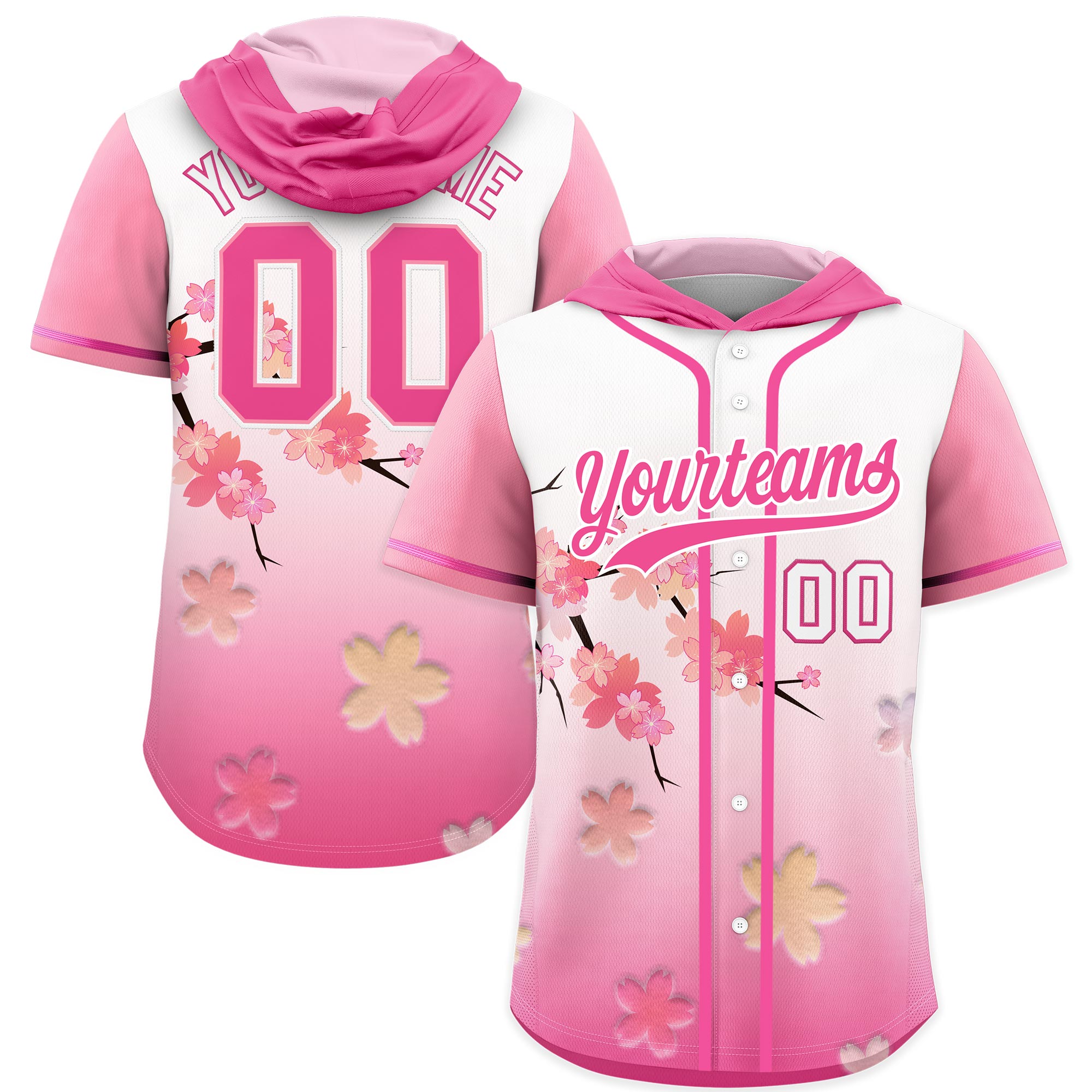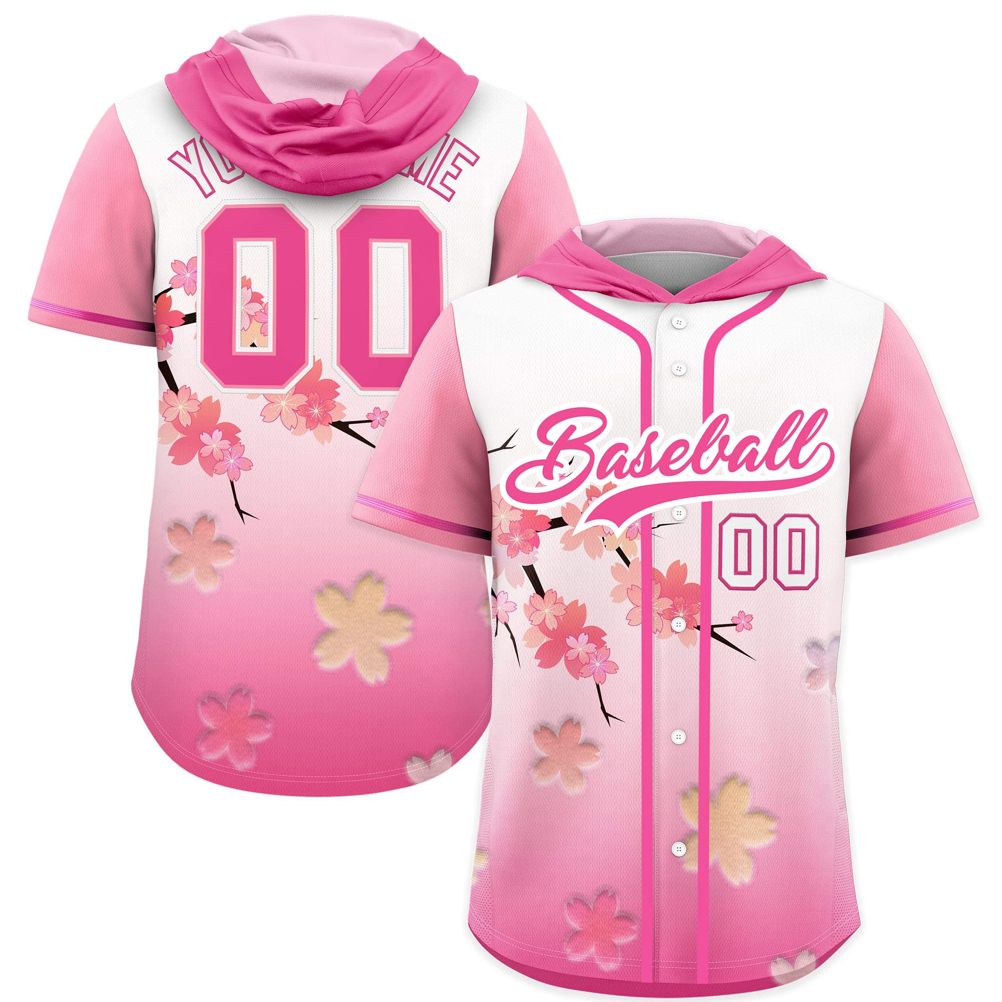 Custom Pink White Cherry Blossoms Raglan Sleeves Wrinkle-Resistant Baseball Hooded Jersey