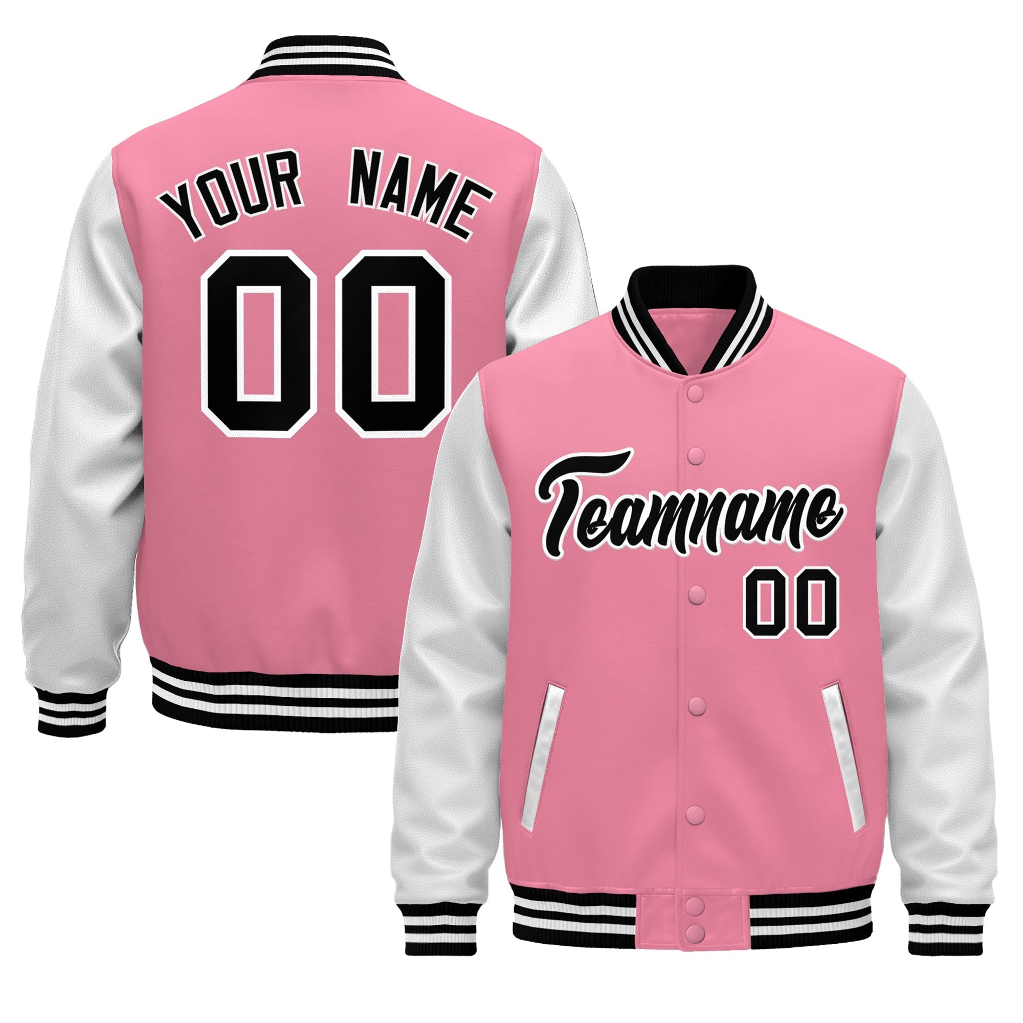 Custom Light Pink White Black Raglan Sleeves Varsity Full-Snap Leather Sleeves Letterman Jacket