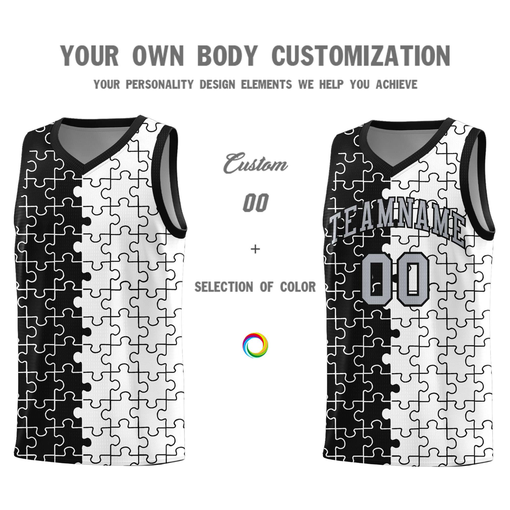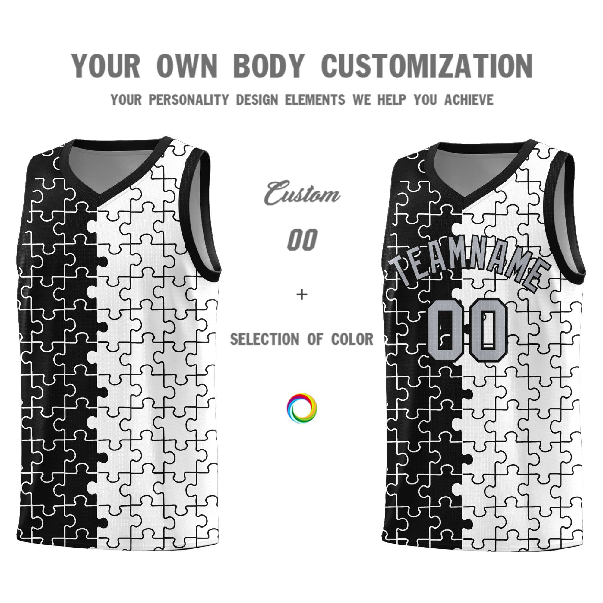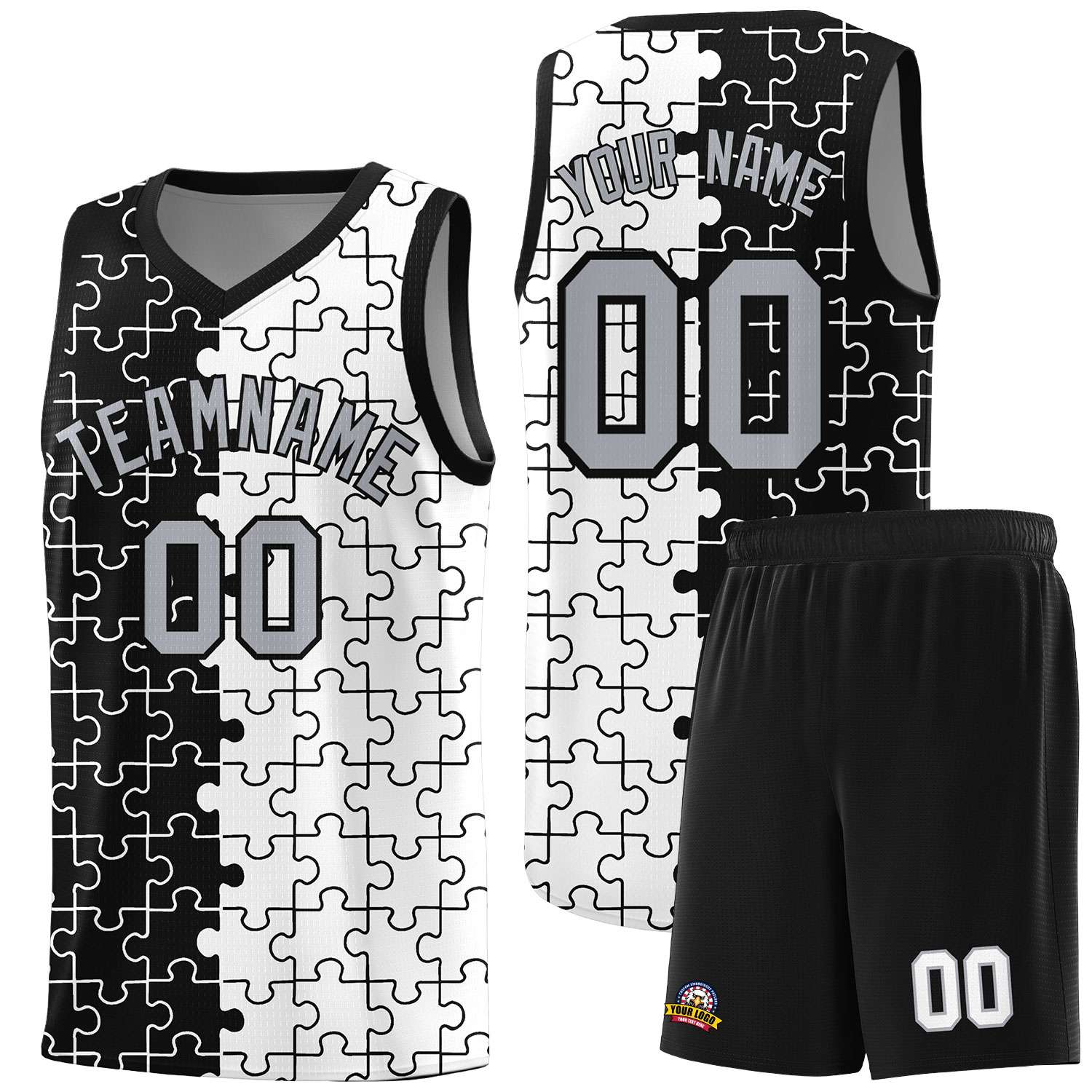 Custom Black White Splid Basketball Kits With Puzzle Pattern