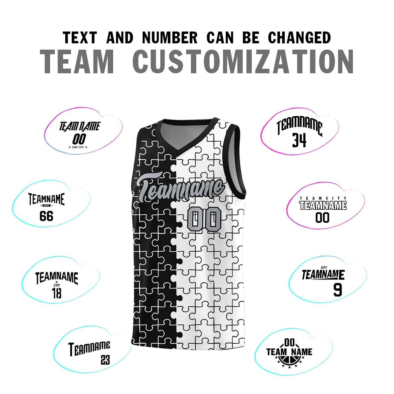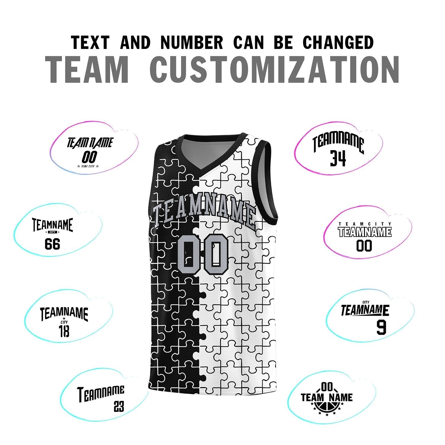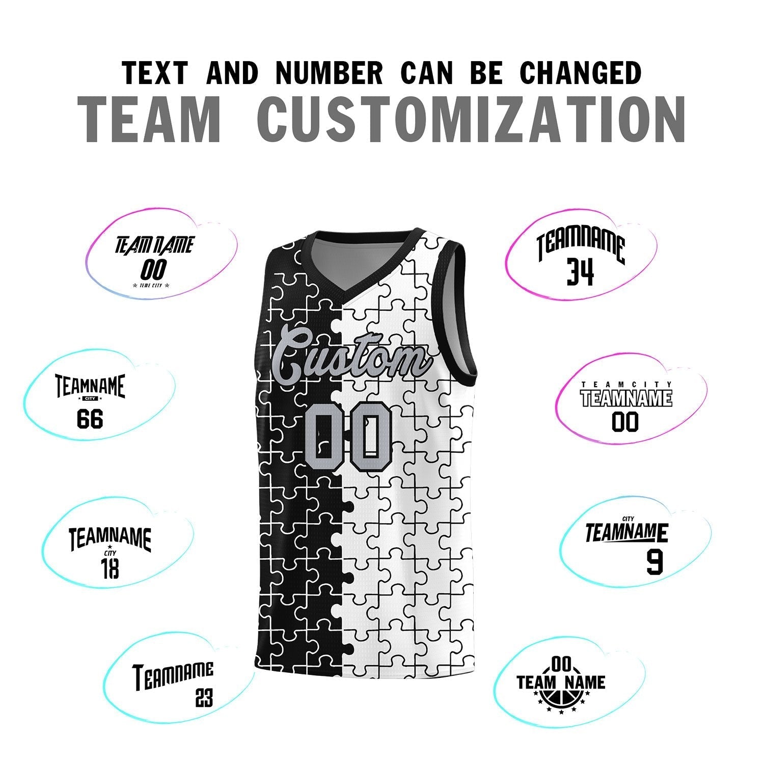 Custom Black White Splid Basketball Kits With Puzzle Pattern