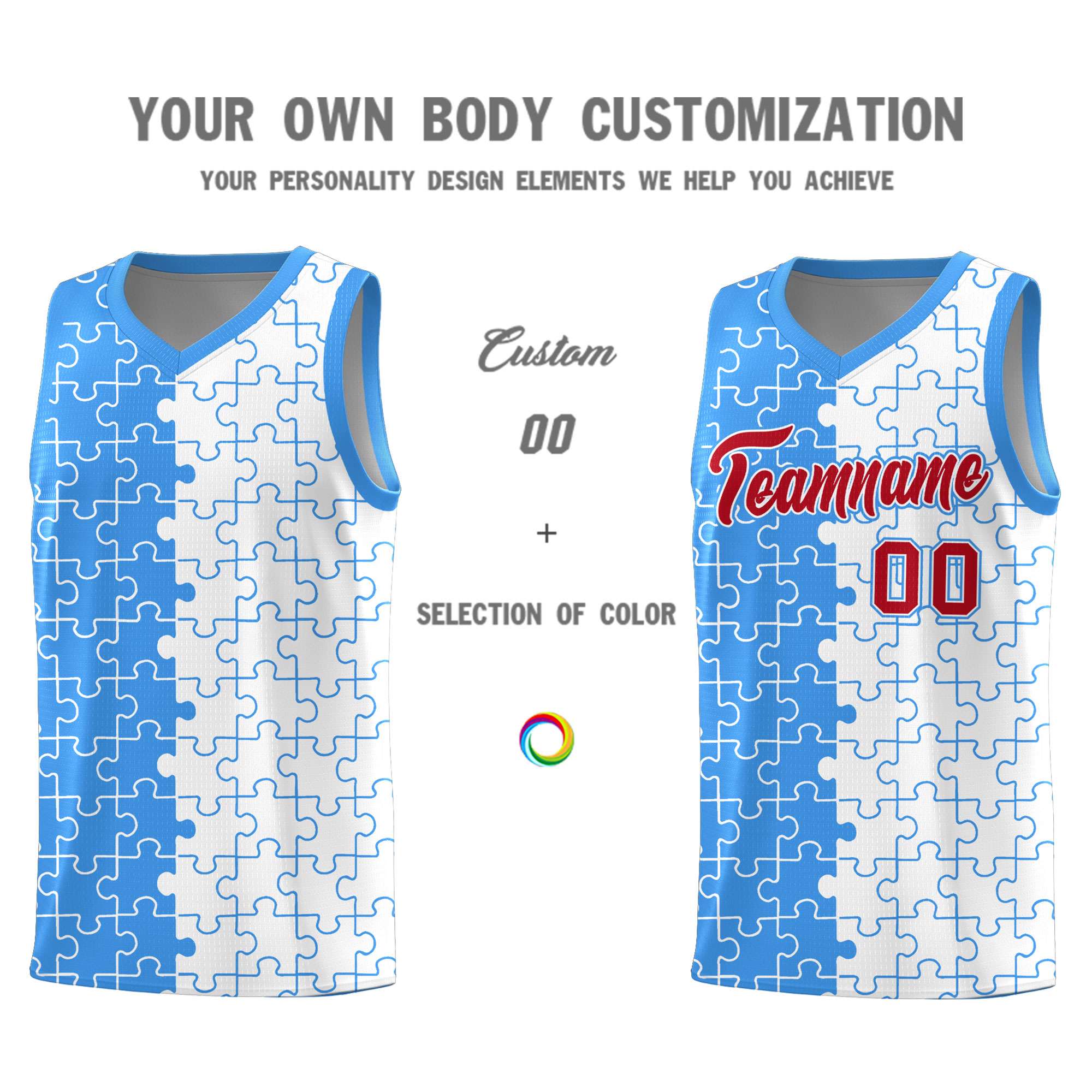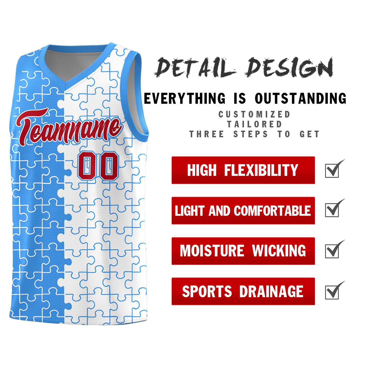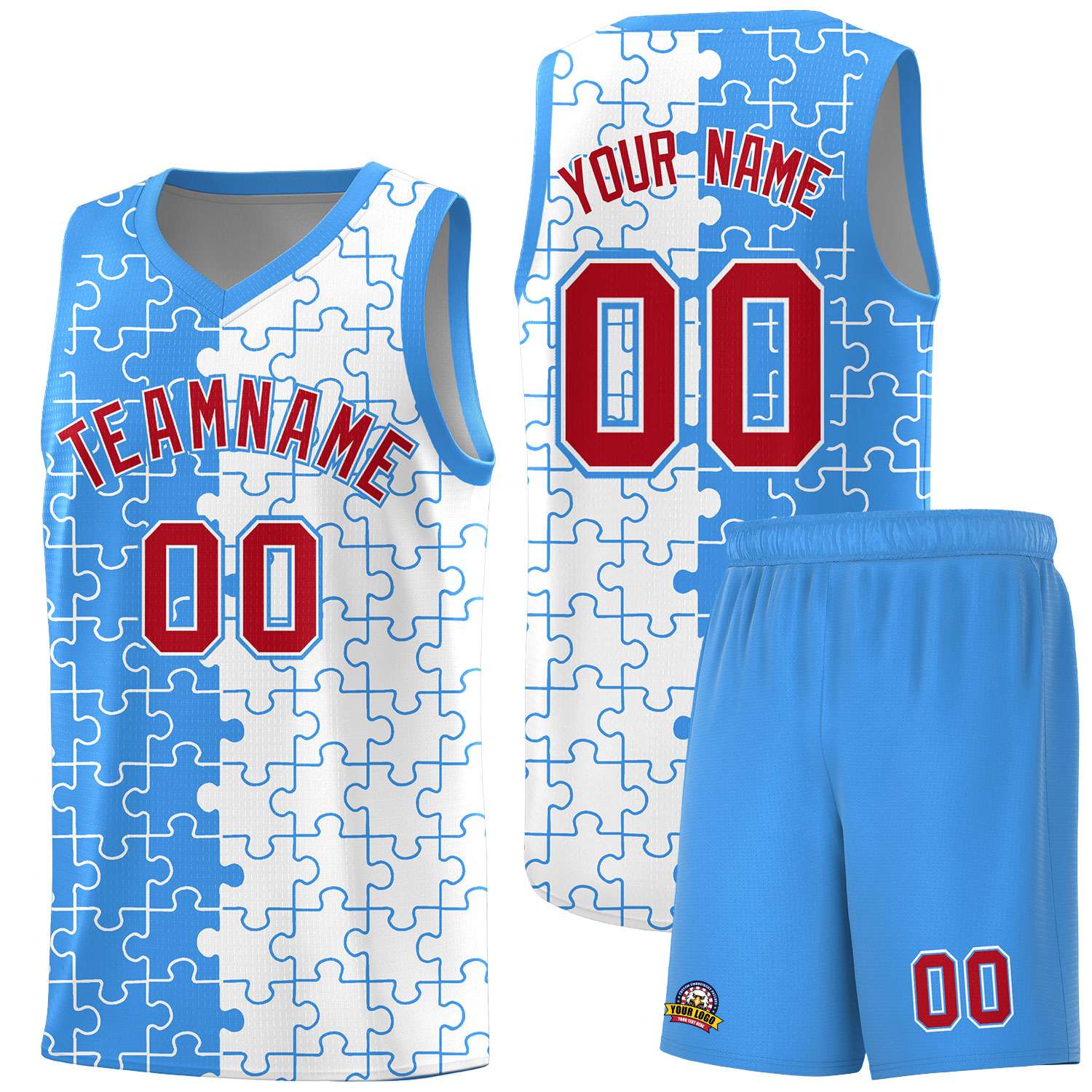 Custom Light Blue White Splid Basketball Kits With Puzzle Pattern