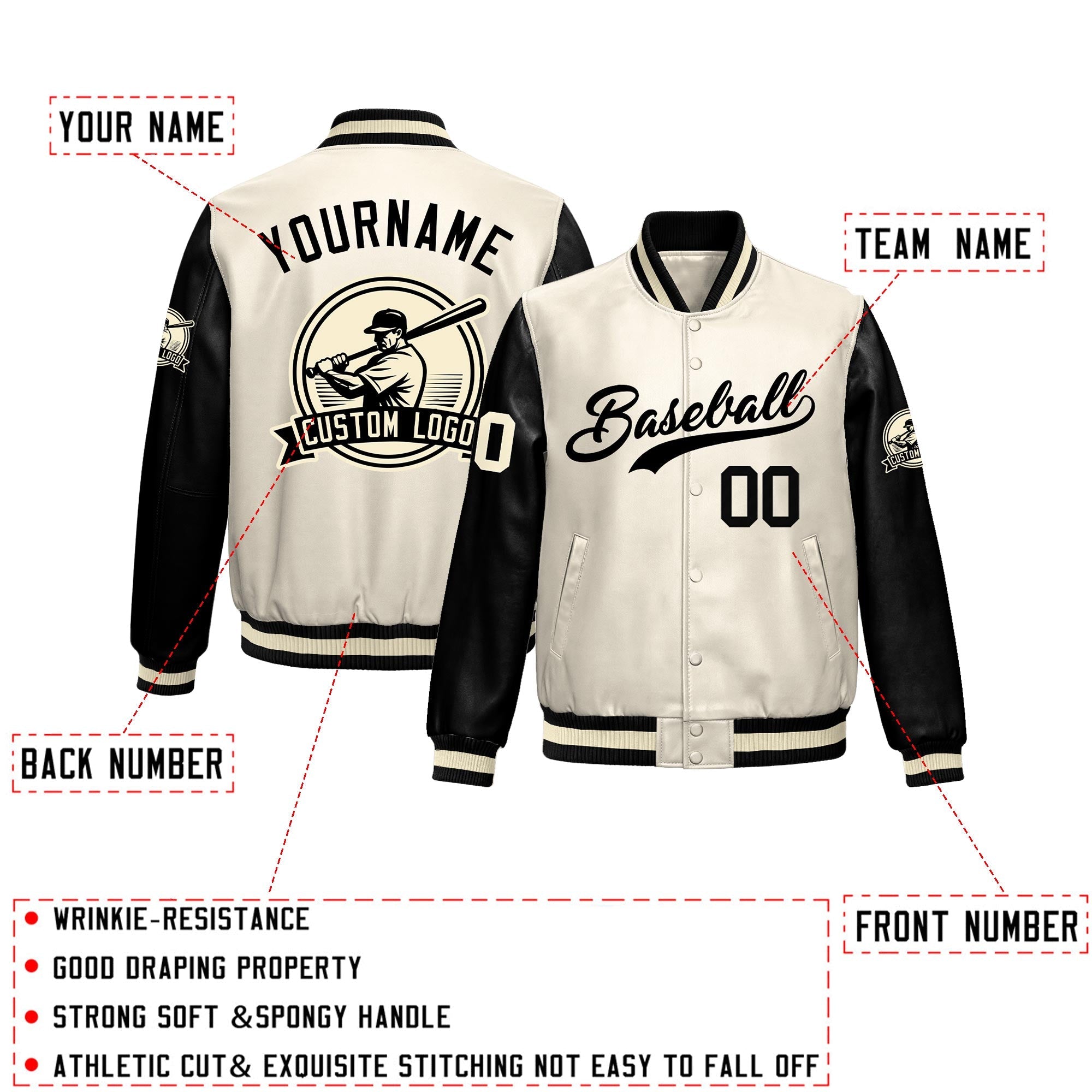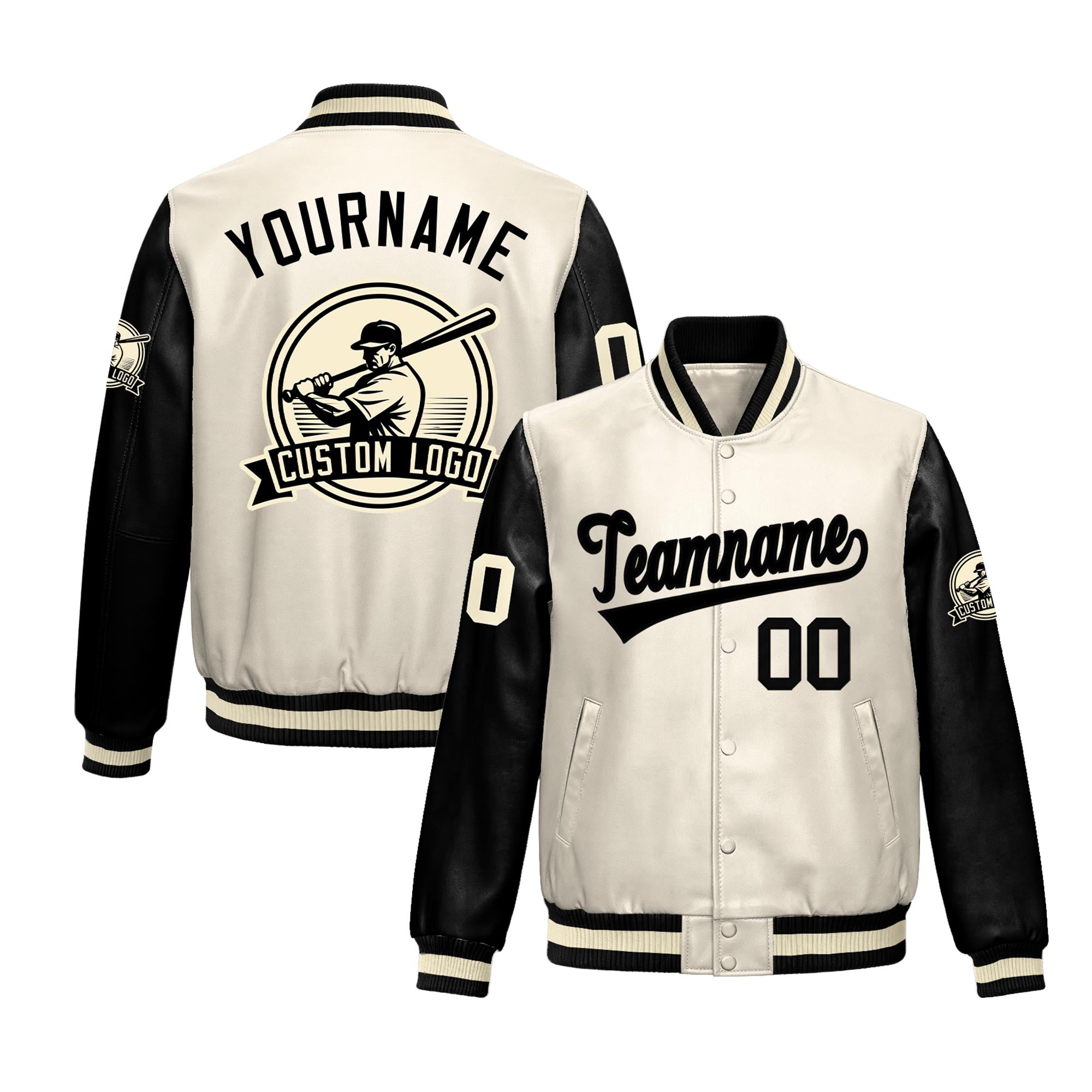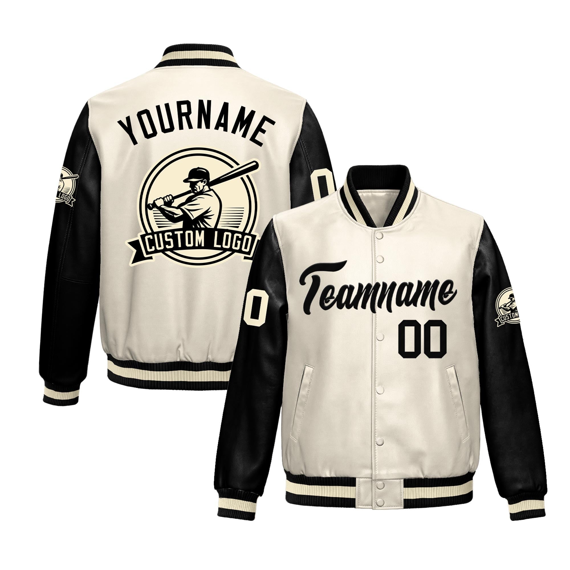 Custom Cream Black Raglan Sleeves Full-Snap Faux Leather Letterman Jacket