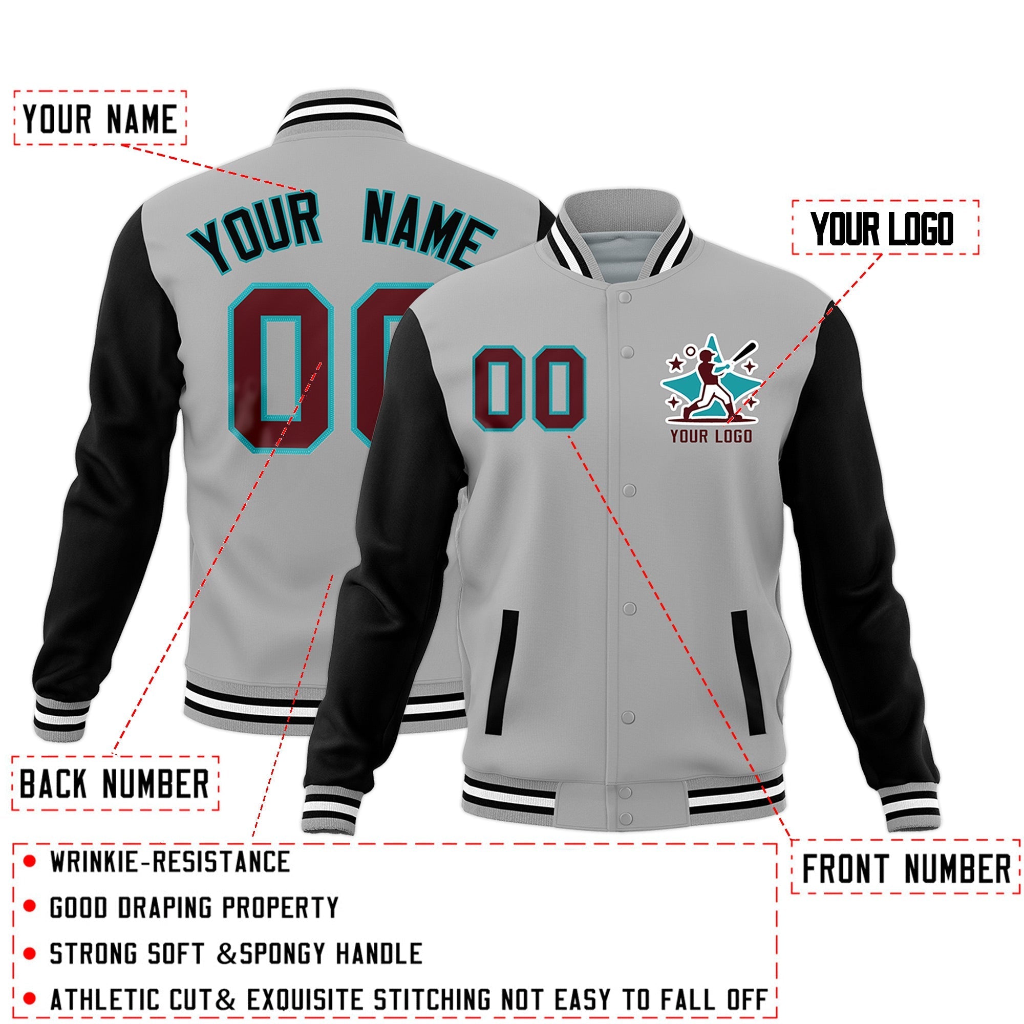 Custom Gray Black White Raglan Sleeves Full-Snap Letterman Cotton Fabric Jacket
