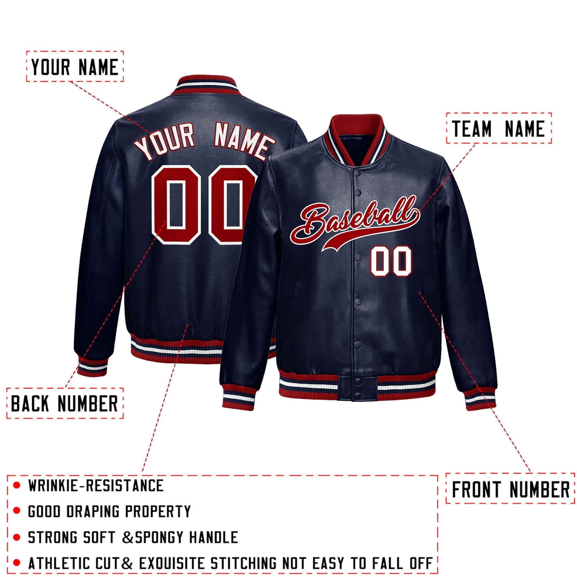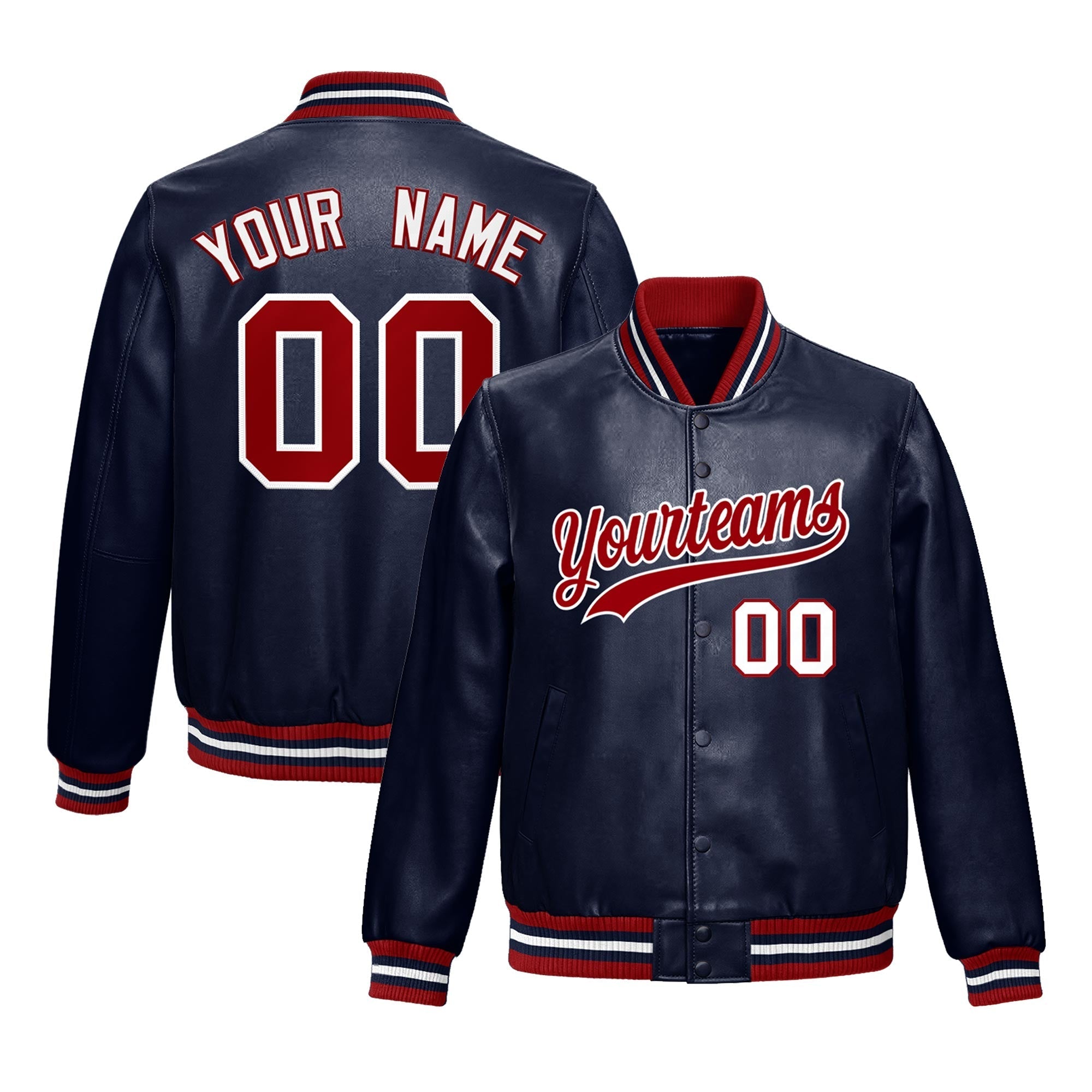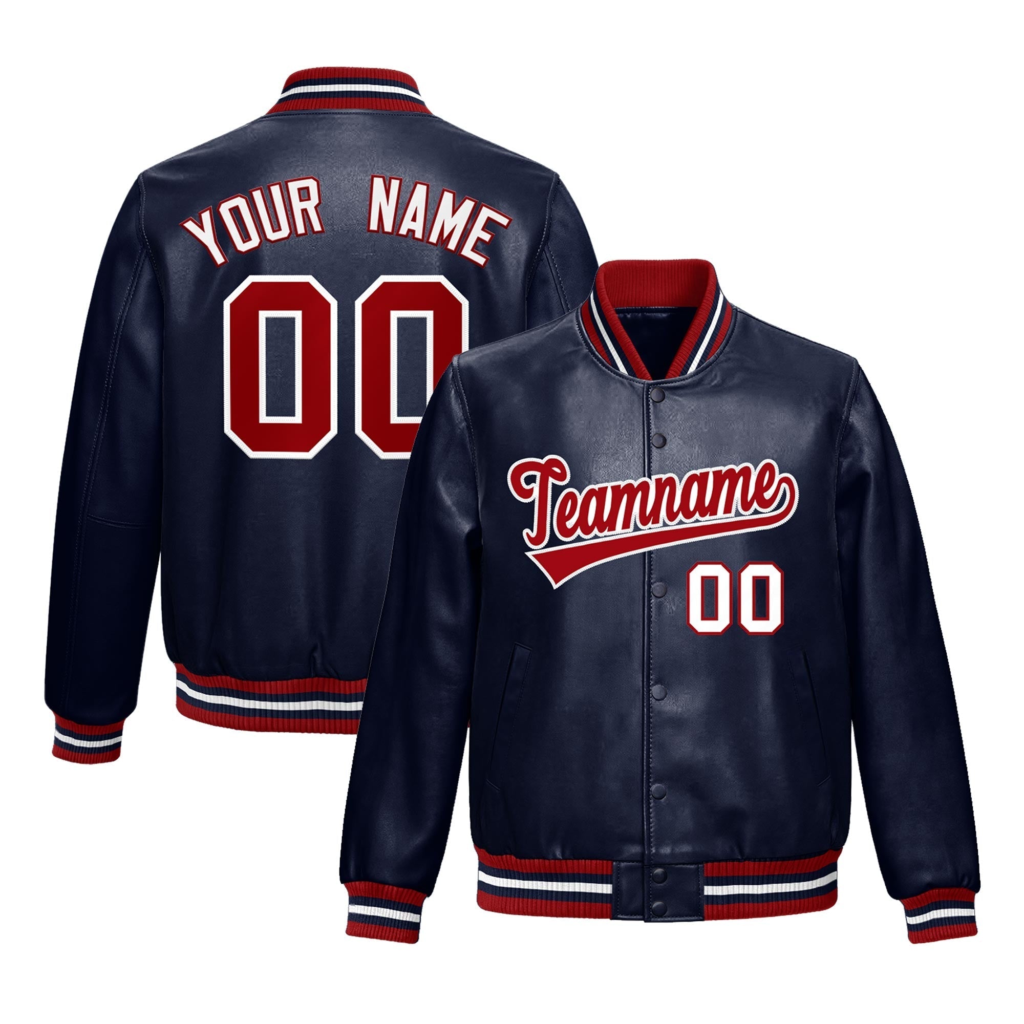 Custom Navy Red Full-Snap Varsity Faux Leather Letterman Jacket