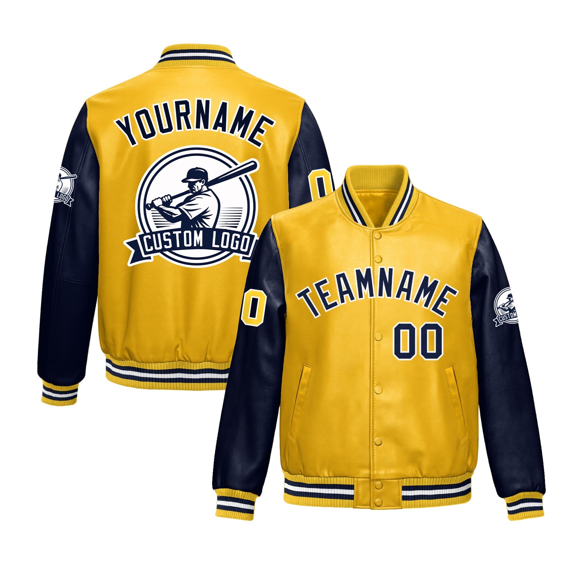 Custom Yellow Navy Raglan Sleeves Full-Snap Faux Leather Letterman Jacket