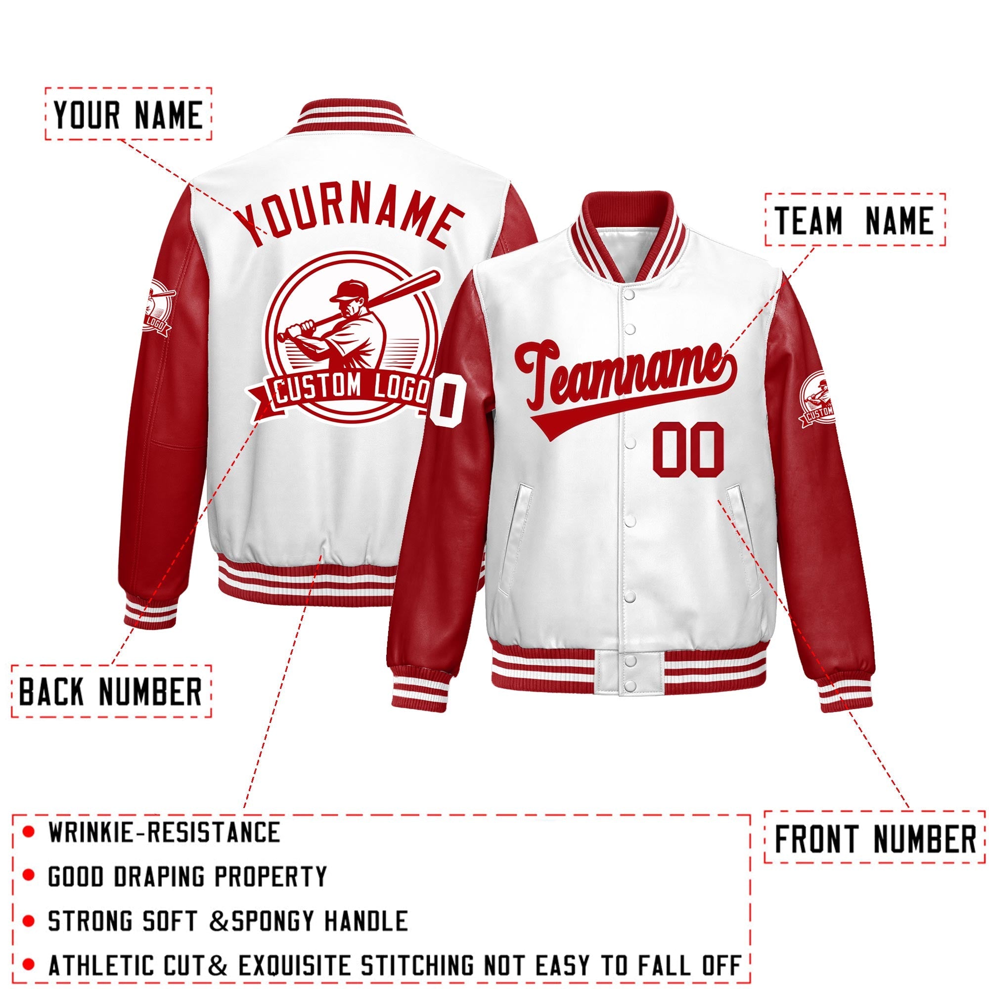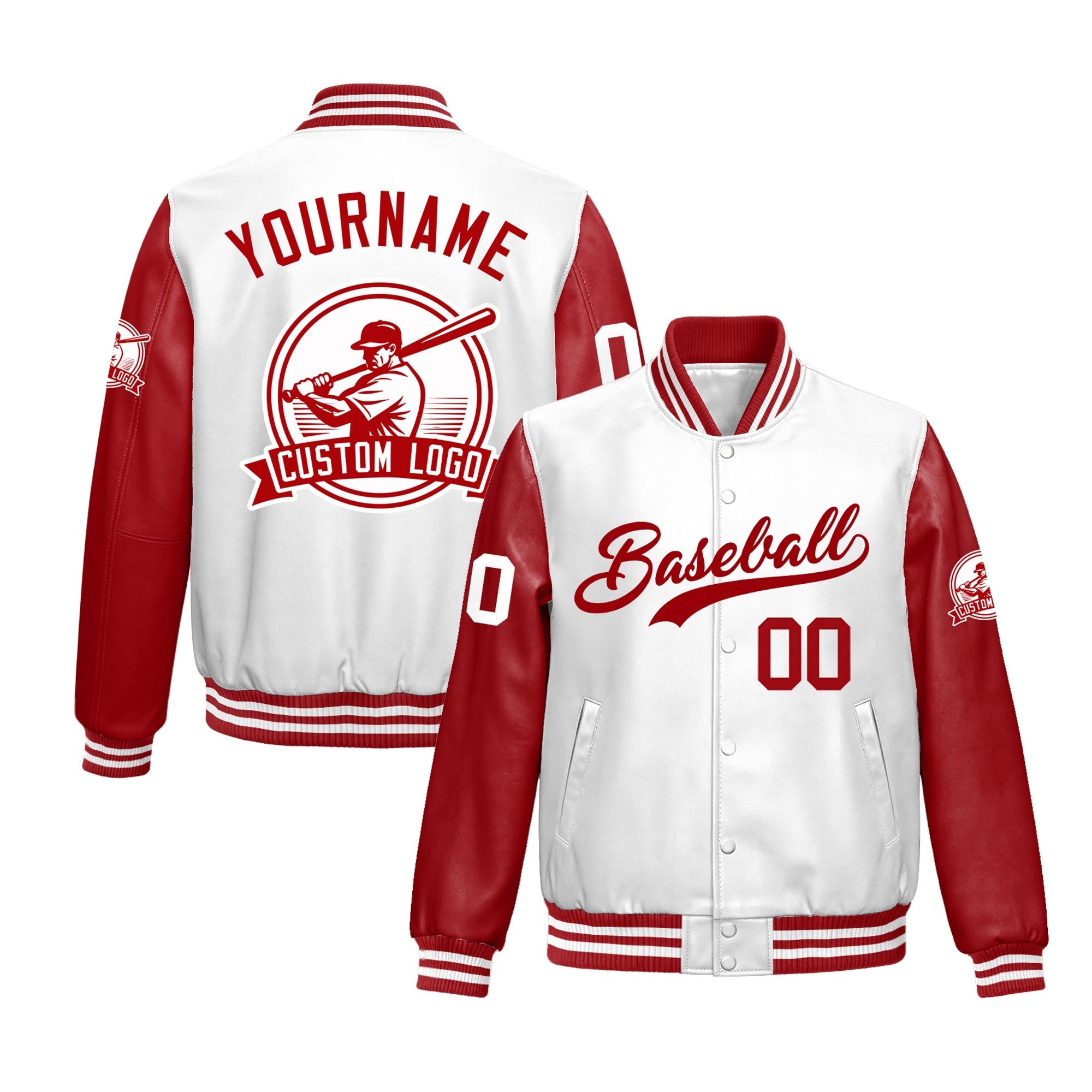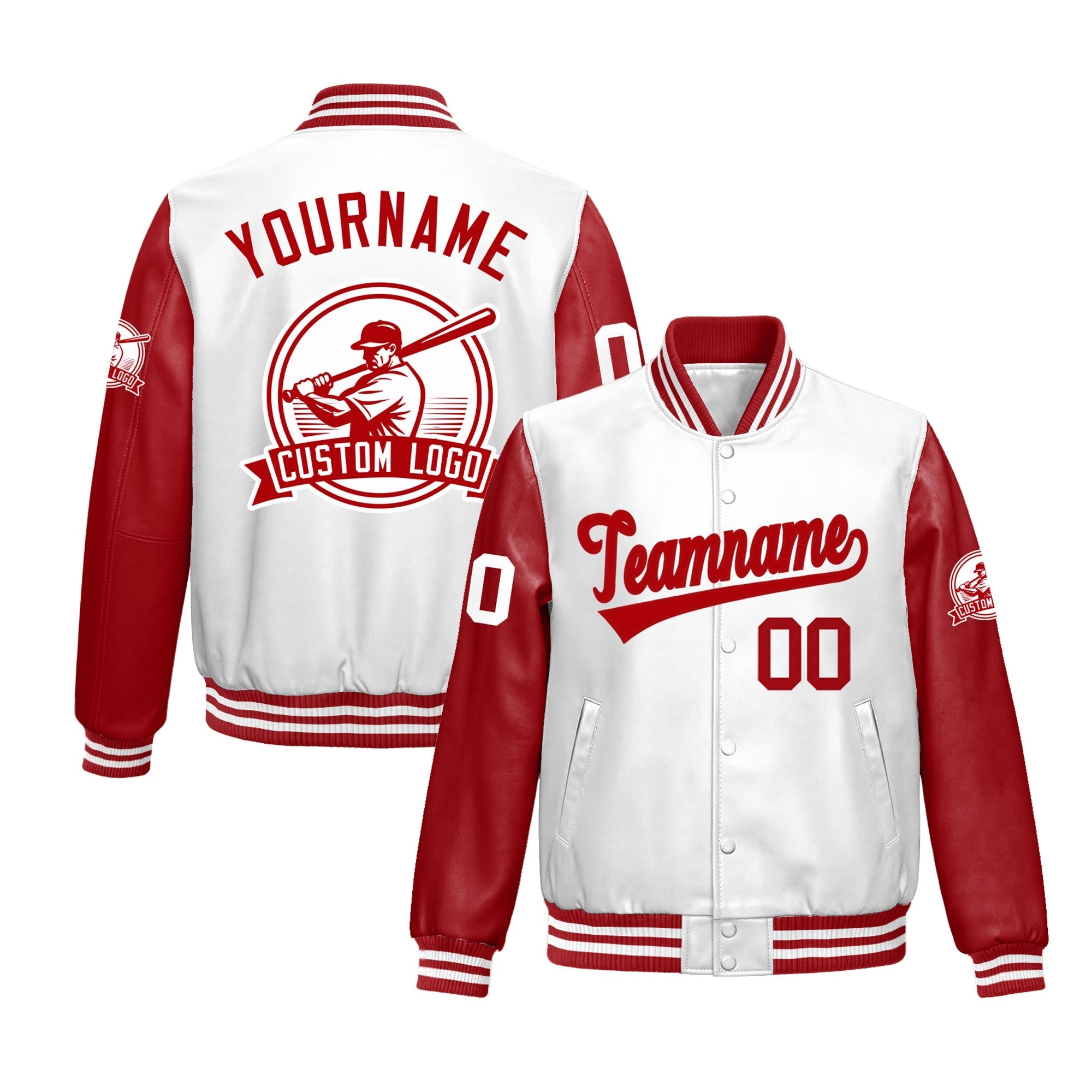 Custom Red White Raglan Sleeves Full-Snap Faux Leather Letterman Jacket